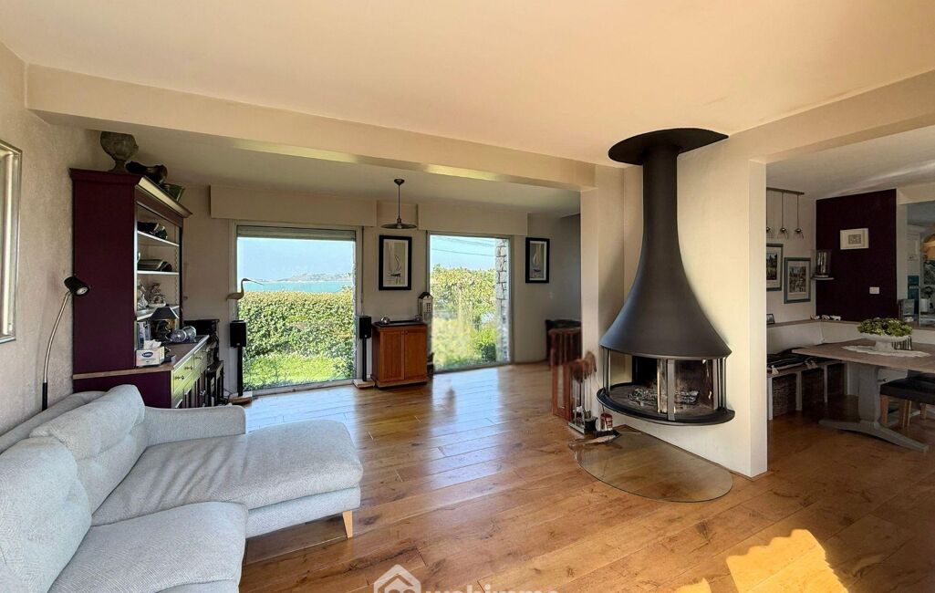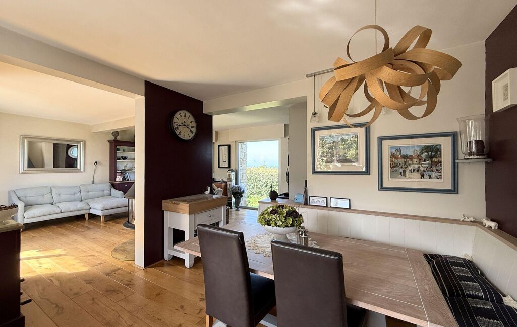 Sur un terrain de 800m², cette maison de 125m2 construite dans les années 1980, a été rénovée et agrandie à plusieurs reprises et offre aujourd'hui de généreux espaces de vie ou chaque pièce bénéficie d'une vue mer.