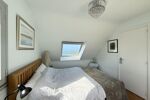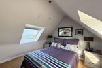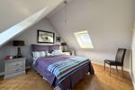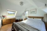 À l'étage, le palier dessert trois chambres, chacune offrant une vue mer, d'une superficie de 9 à 13 m² au sol, ainsi qu'un bureau et une salle de bains avec baignoire et WC.