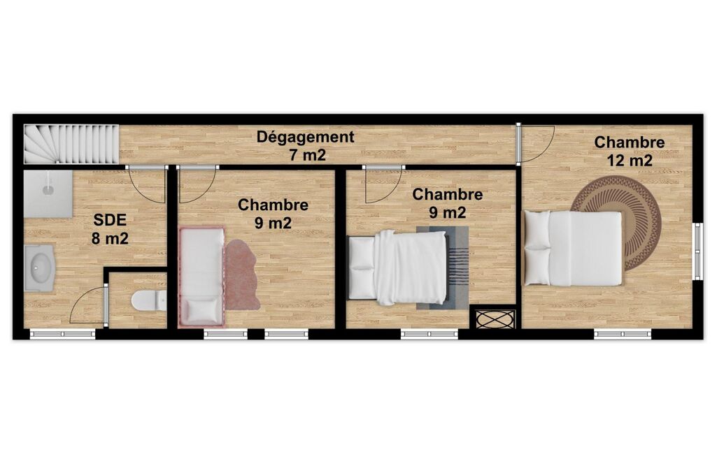 A l'étage : dégagement, 3 chambres, salle d'eau et WC indépendant.