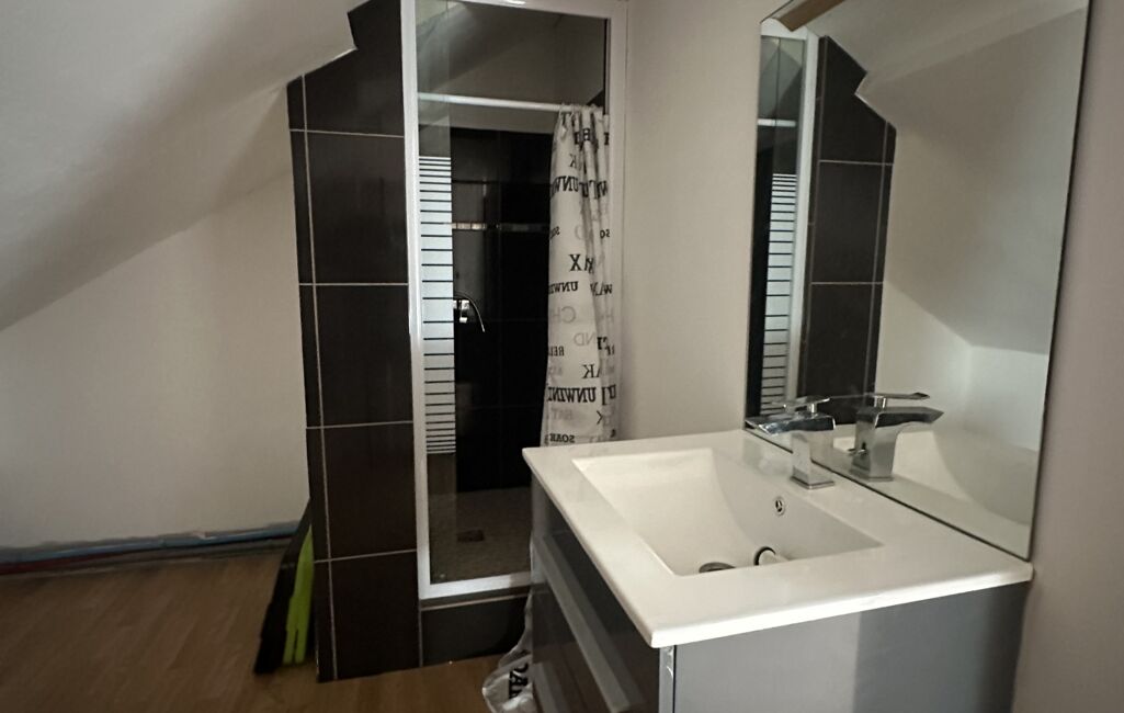 A l'étage une grande chambre avec une salle d'eau et un WC. Grenier à la suite.