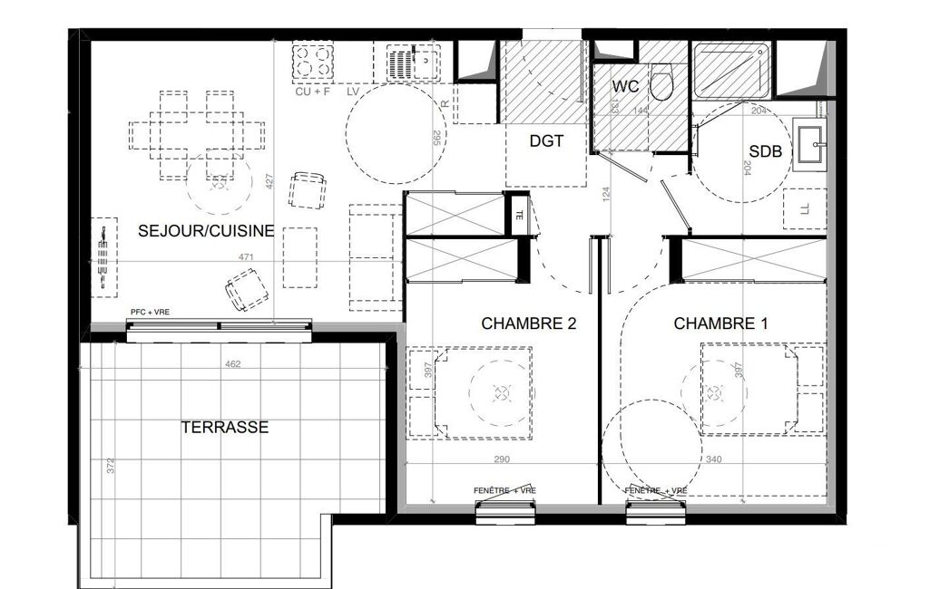 D’une surface de 61,8 m² environ habitables, l’appartement propose une pièce de vie avec séjour et cuisine ouverte de 24 m² environ, offrant un espace convivial et fonctionnel.