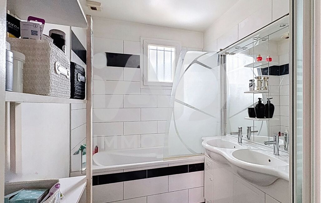 À l’étage : Le palier dessert 4 chambres, une salle de bain avec double vasque, douche, baignoire et sèche-serviettes et WC indépendant.