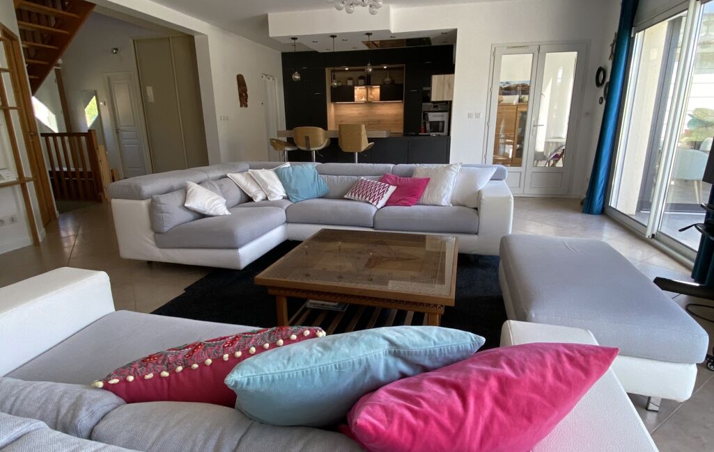 - un séjour de 60 m2 avec cheminée, très lumineux par ses baies vitrées et sa hauteur de plafond (2,70 m),
