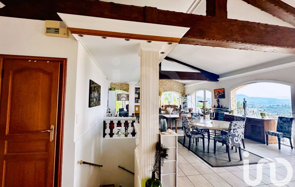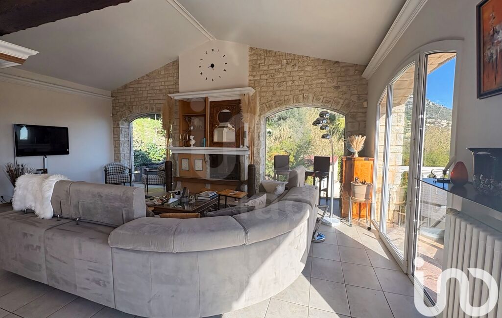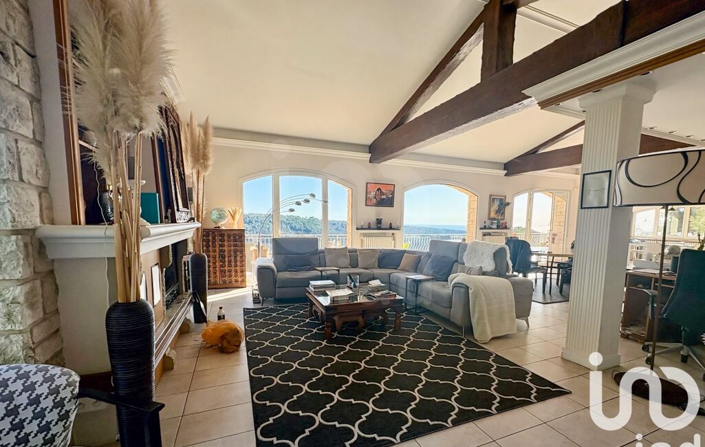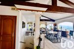 Le cOEur de la maison : un salon cathédrale de 75 m² avec poutres apparentes, cheminée et salle à manger, baigné de lumière grâce à quatre baies vitrées ouvertes sur une terrasse panoramique de 44 m², offrant un belvédère unique sur la Méditerranée- La cuisine ouverte de 22 m², entièrement équipée, dispose de son espace repas et d’un accès direct au jardin.Toilettes invités-