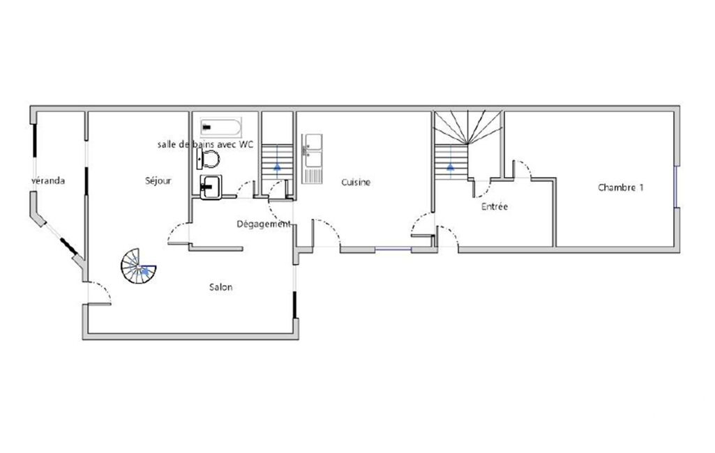 RDC : entrée, double séjour avec accès à la véranda, cuisine, salle de bains + wc, chambre.