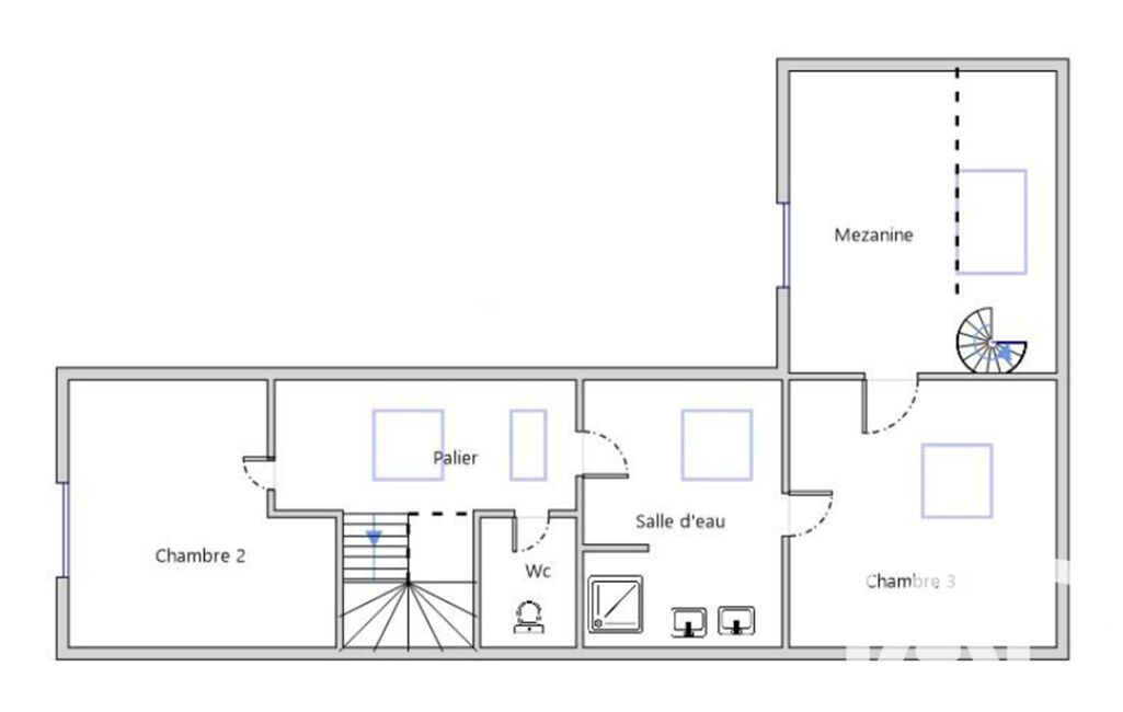 1er : bureau en mezzanine, 2 chambres spacieuses, wc, salle d’eau.