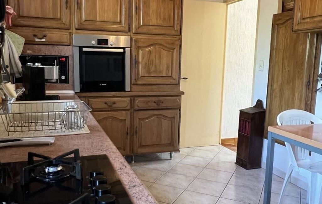 La maison se compose en rez-de-chaussée d'un beau dégagement avec penderie invités ouvrant sur séjour avec salon cheminée insert (37 m² environ) et rangement, sortant sur terrasse au Sud d'environ 30 m² environ. La cuisine équipée et séparée comporte un cellier attenant servant de réserve.