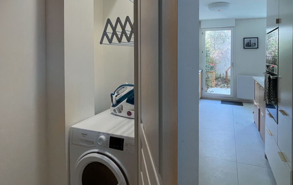 Un toilette avec espace buanderie, situé à l’entrée, complète ce niveau de manière pratique et astucieuse.