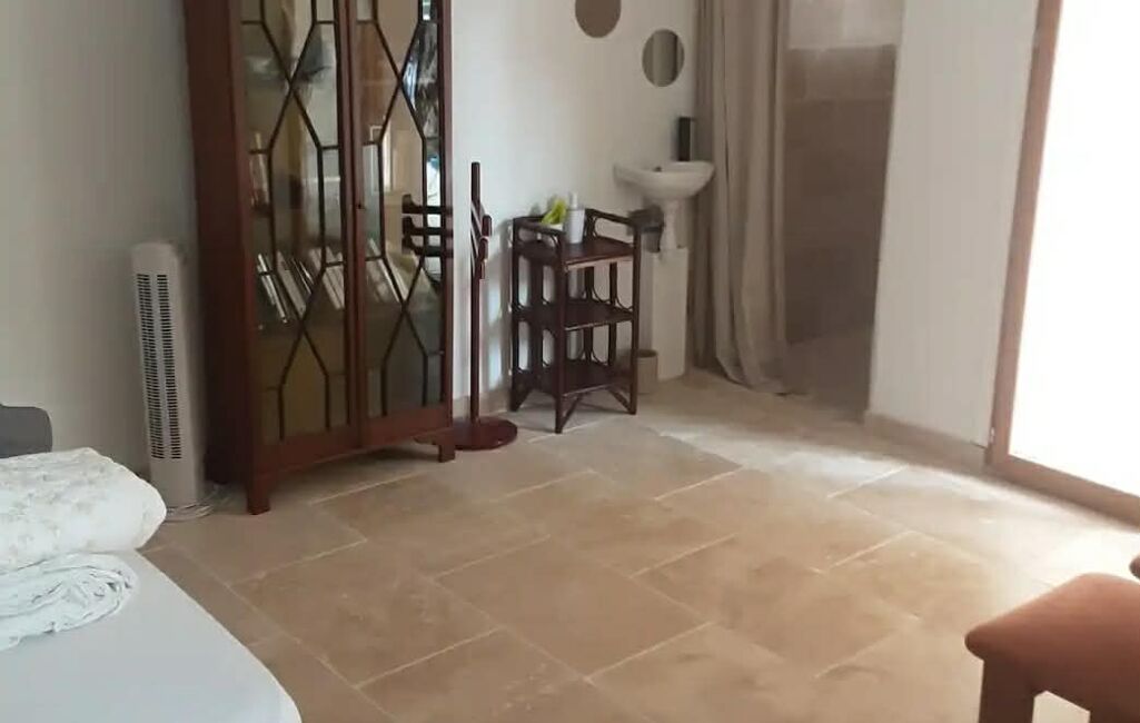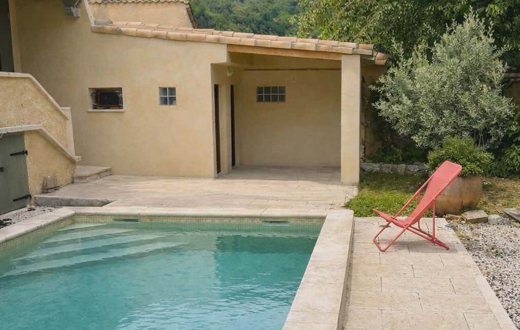 On accède ensuite à la propriété par un portail ouvrant sur le jardin, agrémenté d’une piscine carrelée d’environ 26 m². Depuis cet espace extérieur, une chambre indépendante de 20 m² avec douche à l’italienne et WC complète l’ensemble.