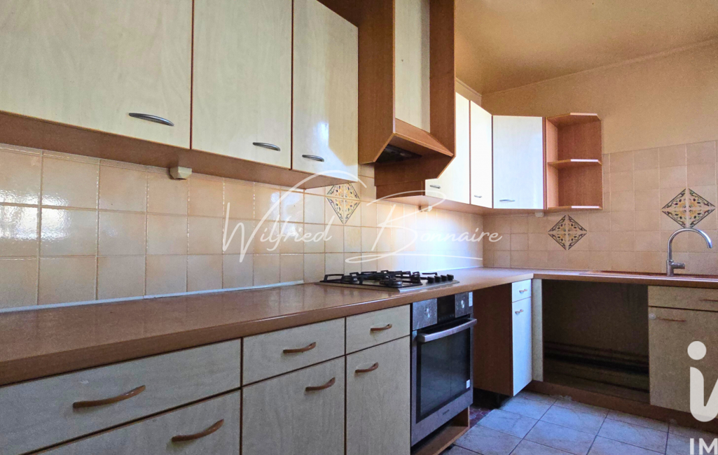 La cuisine indépendante bénéficie d’une baie vitrée ouverte sur le séjour, apportant davantage de lumière et créant une circulation visuelle agréable entre les espaces.