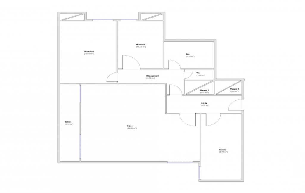 Le séjour constitue le point central du logement, avec une surface d’environ 28 m².