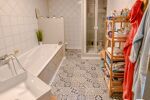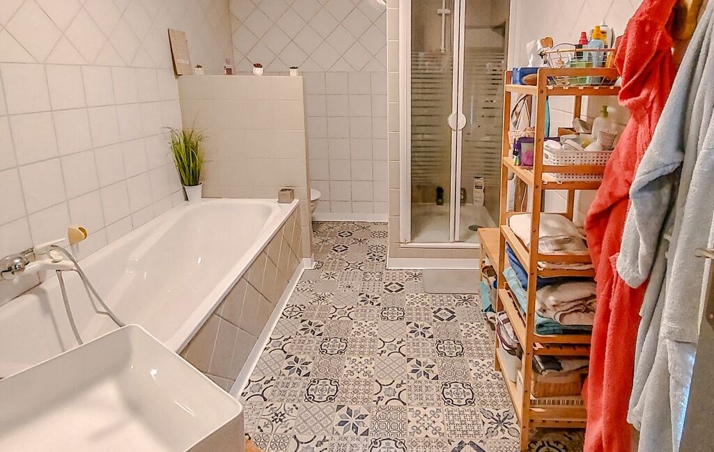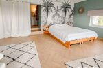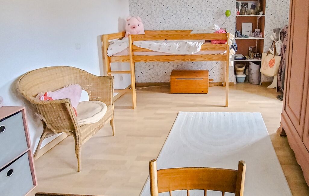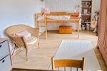 A l’étage le palier dessert d’un côté, trois chambres et une salle de bain complète, et de l’autre côté, un bureau, une salle de jeux pouvant servir de chambre d’appoint, un WC et l’espace parental de nuit avec salle de bain également.