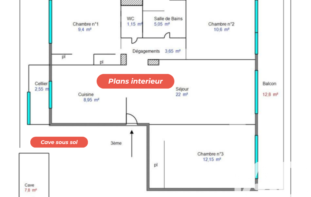 - Nbre. de chambres : 3