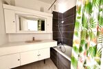 La partie nuit comporte un dégagement avec des rangements, deux chambres, d’une salle de bains et de toilettes séparées. Une troisième chambre est envisageable.
