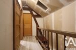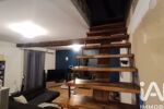 Un escalier en bois mène à l’étage, où un palier dessert deux chambres dont une séparée, ainsi qu’une salle de bain.