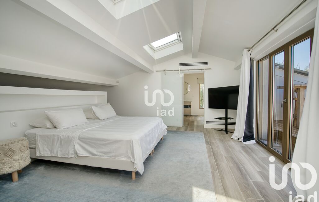 À l’étage, une suite parentale avec dressing, salle de bain complète et terrasse tropézienne bénéficie d’un aperçu mer panoramique.