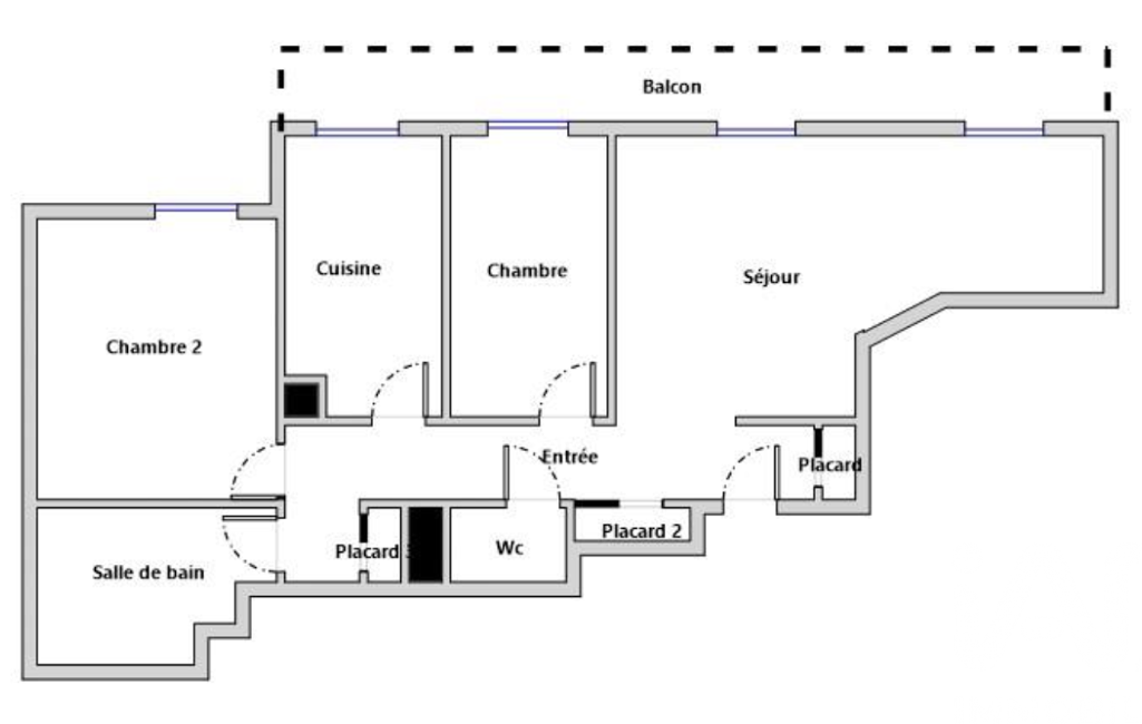 L'appartement se situe en étage (avec ascenseur) et comprend: une entrée avec placards, un séjour avec un balcon de 16 m2 (exposition Est), un WC séparé, une cuisine équipée, deux chambres et une salle de bains (baignoire, vasque et sèche serviettes).