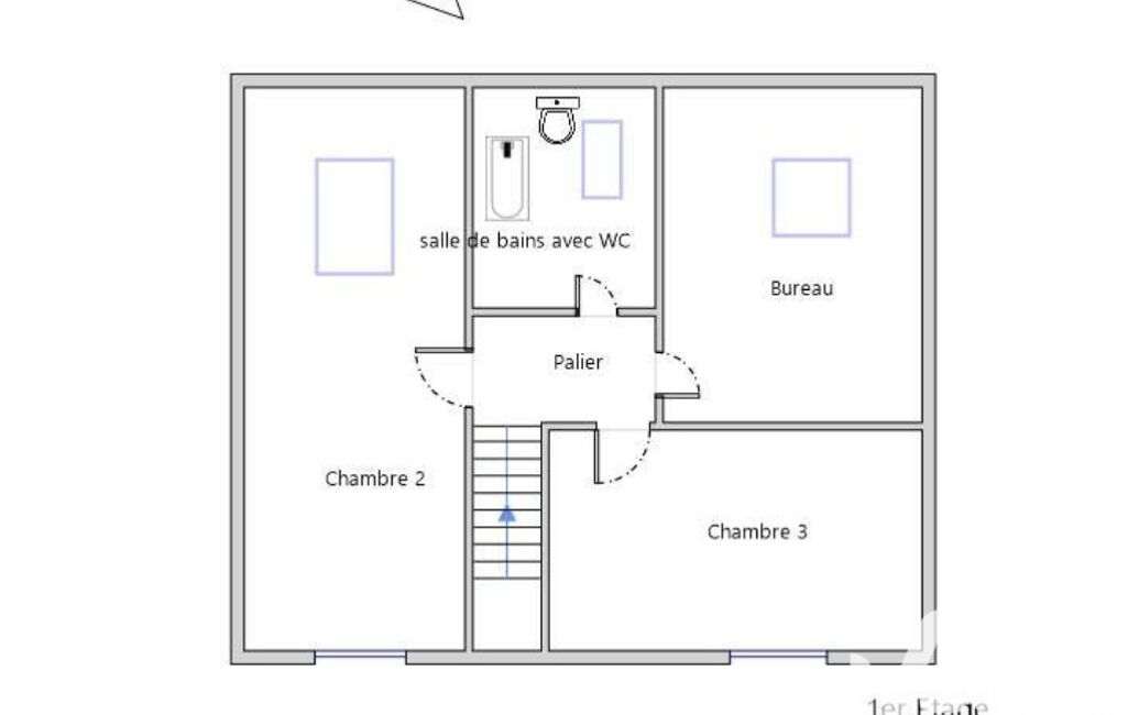 Un palier dessert trois chambres (dont une faisant office de buanderie) ainsi qu’une salle de bains avec WC.