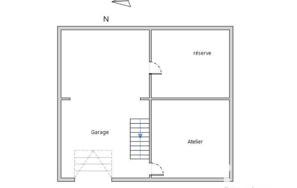 Sous-sol compartimenté en trois espaces : garage, cave et atelier, idéal pour le stockage, le bricolage ou un espace complémentaire.