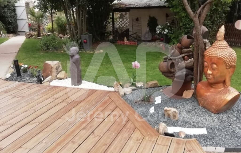 Une terrasse bois accompagnent une piscine hors-sol bois d’environ 20 m². Le jardin arboré, sans vis-à-vis, offre un cadre intimiste et verdoyant. Une terrasse côté Sud avec une pergola bois est également présente.