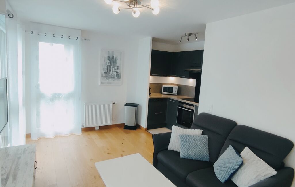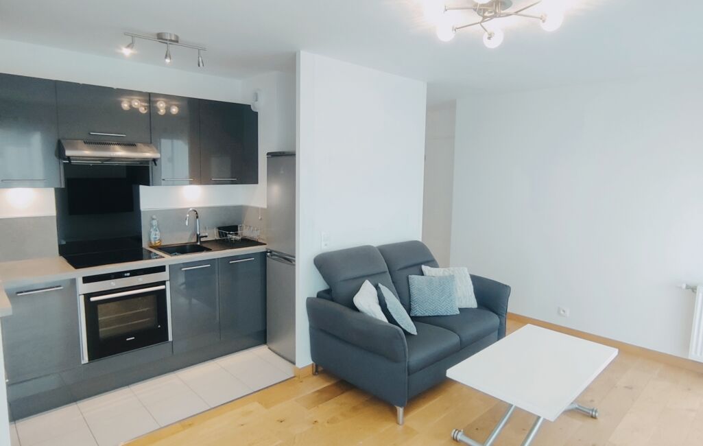 iad France - Mehdi Hamdi vous propose: Appartement Kaufman & Broad, 2 pièces, de 45m2, vendu équipé et meublé composé d'une longue entrée avec rangement, une salle d'eau avec wc, une chambre de 12m2 avec placard intégré, un séjour lumineux avec un coin cuisine donnant sur un vaste balcon de plus de 8m2 exposé plein sud. Une place de parking privée en sous-sol vient compléter ce bien.
