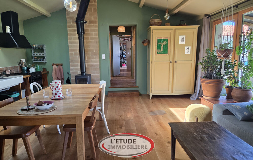 La première partie (maison d'habitation d'environ 110 m2) est composée d'une entrée avec placard, d'une pièce à vivre (avec poêle mixte bois ou granulés) totalement ouverte sur une cuisine aménagée et équipée (soit 54 m2 au total) donnant sur une terrasse carrelée plein sud de 35 m2. Un dégagement dessert trois belles chambres (11,25 m2, 11,30 m2 et 13,10 m2), dont deux avec placards et une avec lit escamotable, un WC séparé suspendu et une salle d'eau (vasque, sèche-serviettes et douche).