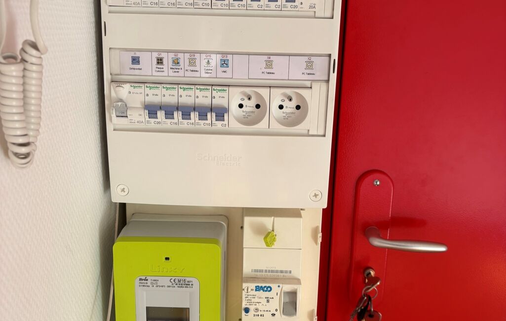 Menuiserie PVC double vitrage équipée de volets roulants électriques, porte blindée, compteurs individuel.
