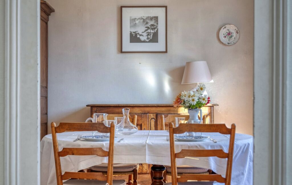La cuisine dînatoire, restée dans son charme d’origine, offre un bel espace de vie et pourra être revisitée selon les goûts de chacun, tout en conservant son esprit familial et accueillant. Une salle à manger attenante complète cet ensemble et offre un cadre parfait pour recevoir ses proches ou partager des repas entre amis.