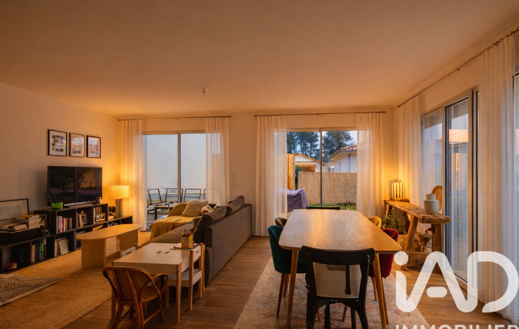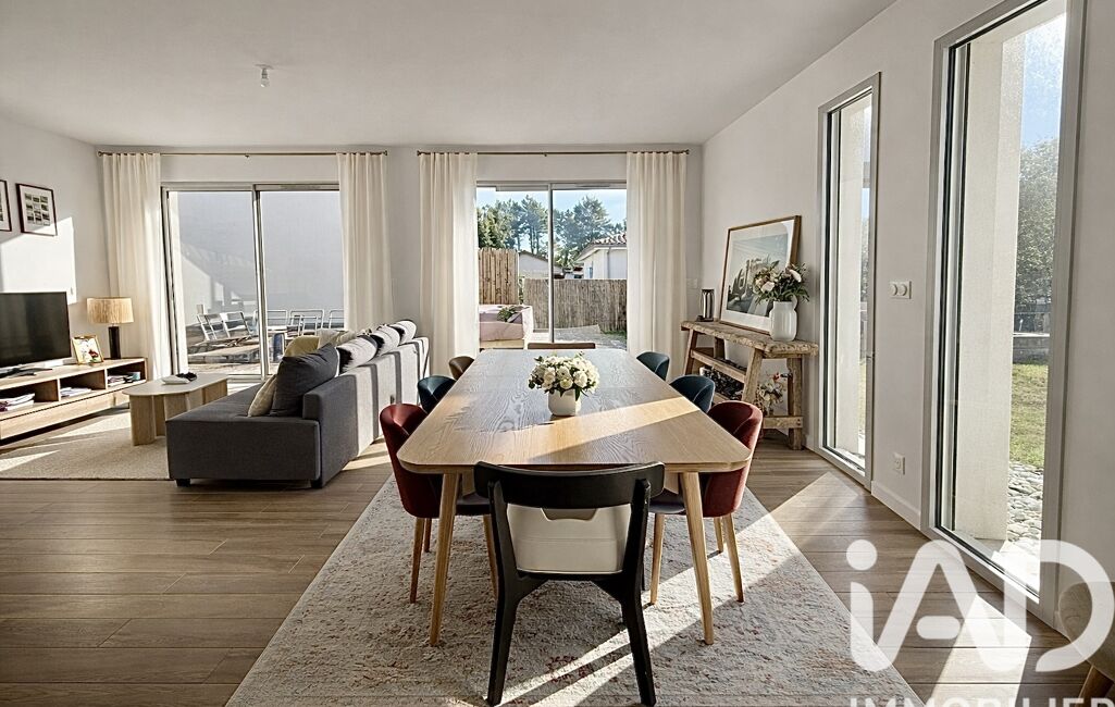 La pièce de vie, baignée de lumière, accueille un salon, une salle à manger et une cuisine semi-ouverte entièrement équipée. De larges ouvertures prolongent naturellement l’espace vers une grande terrasse en bois et la piscine, créant un véritable lieu de vie intérieur-extérieur, idéal pour profiter du climat doux des Landes.
