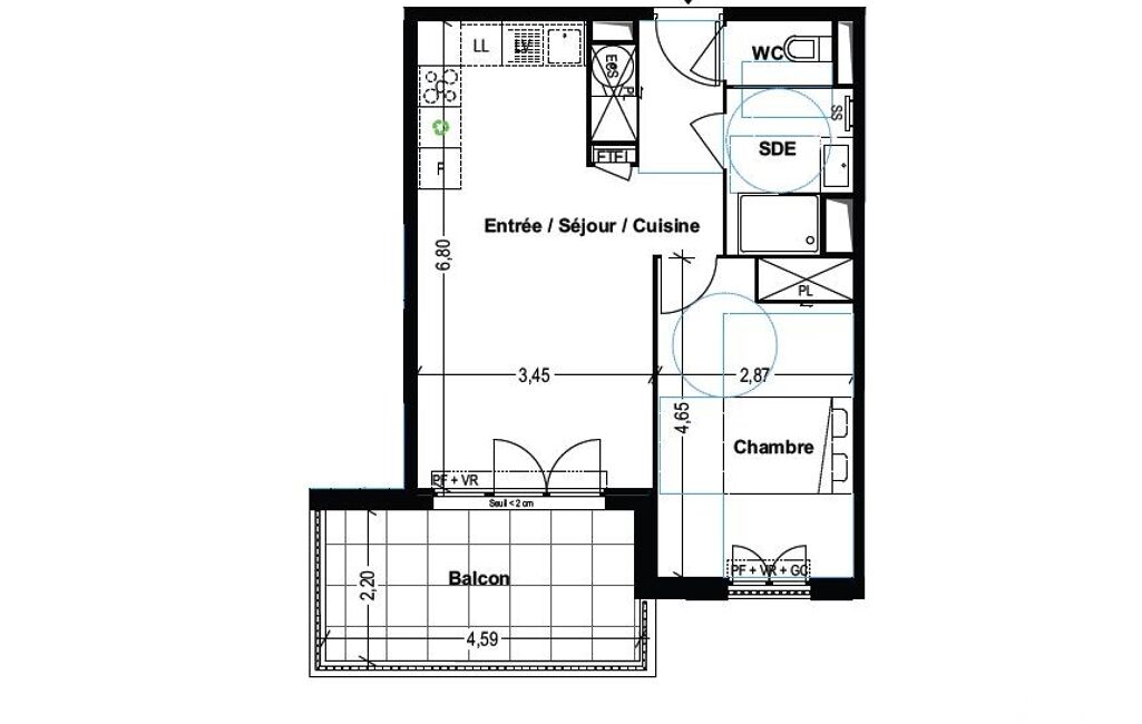 T2 de 45.10 m² environ avec balcon de 10.10 m² environ et garage.
