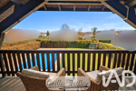 À l’étage, une mezzanine dessert une salle d’eau avec douche et baignoire, un WC et surtout deux très grandes chambres qui ont chacune un balcon avec une vue sur le paysage.