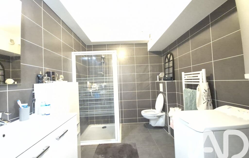 Une grande salle de bain avec douche, sèche-serviettes et emplacement pour machine à laver complète l’ensemble.