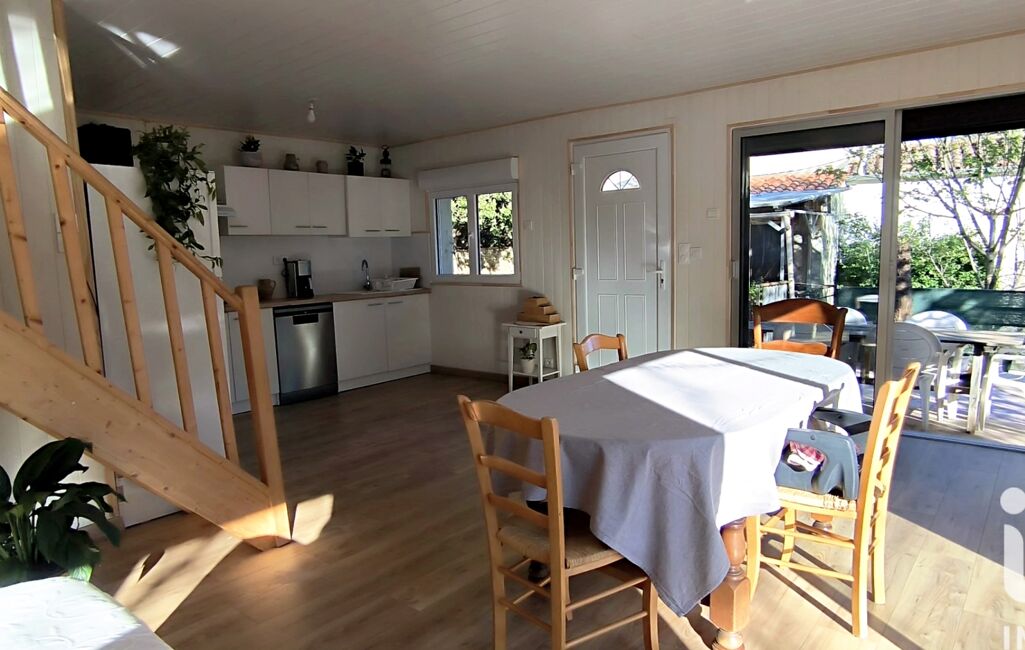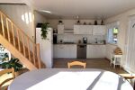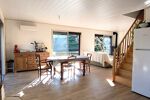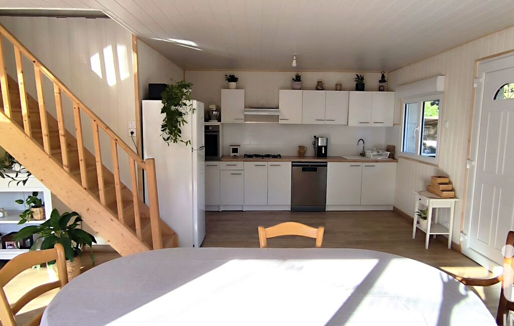 Au rez-de-chaussée, depuis la terrasse, découvrez une spacieuse et lumineuse pièce de vie avec cuisine équipée et fonctionnelle chauffée par poêle à granulés et climatisation réversible.
