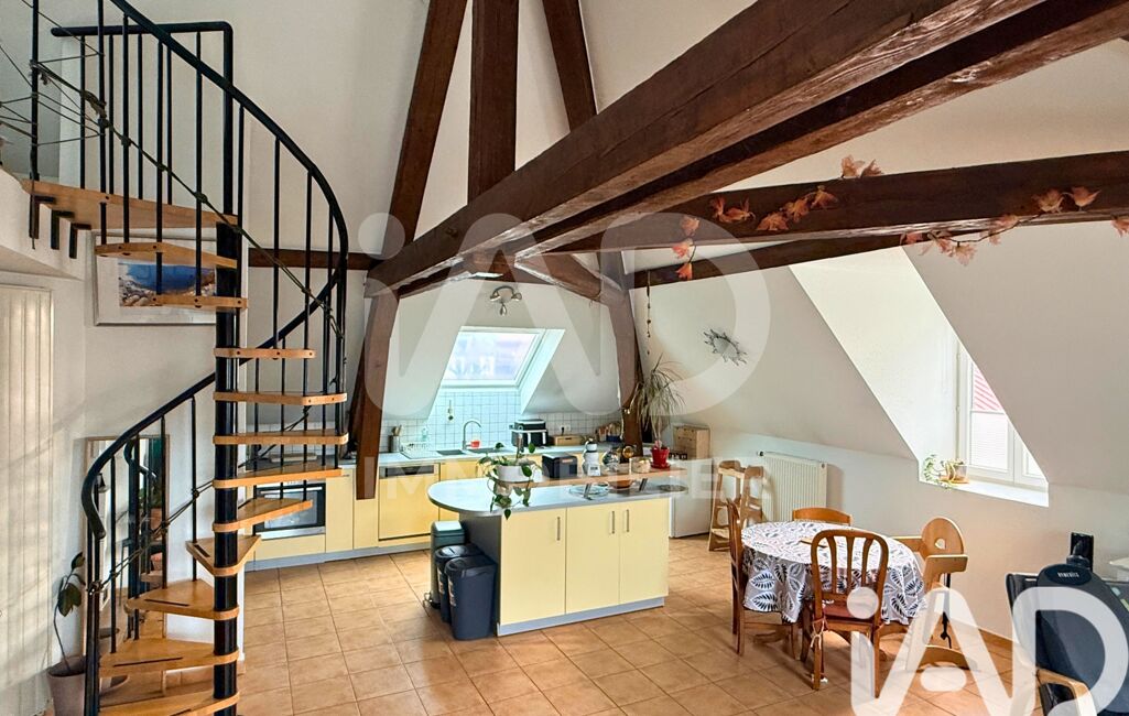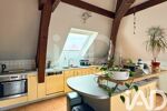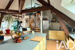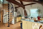 A ce niveau, vous découvrez une vaste pièce de vie avec cuisine ouverte, mise en valeur par un toit cathédrale et de belles poutres apparentes, créant un espace lumineux et convivial.