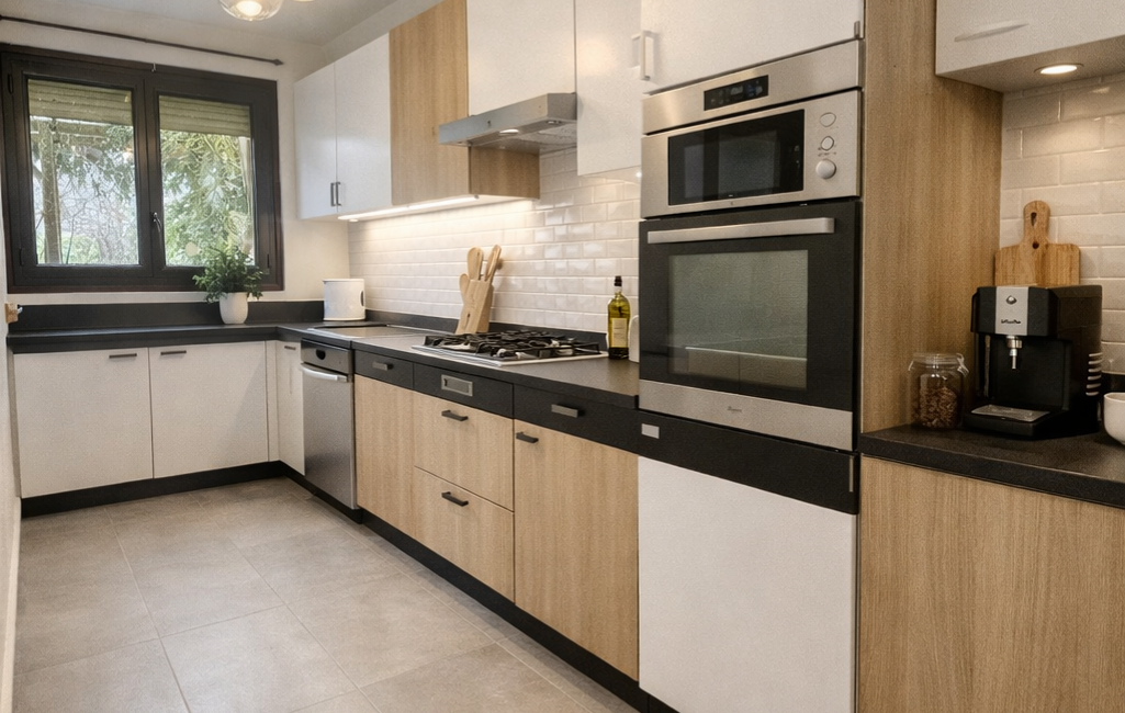 Au rez-de-chaussée, vous profiterez d’un vaste salon / salle à manger de 46 m², lumineux et convivial, d’une cuisine de 10 m², d’un cellier pratique, d’un garage ainsi que d’un WC indépendant.
