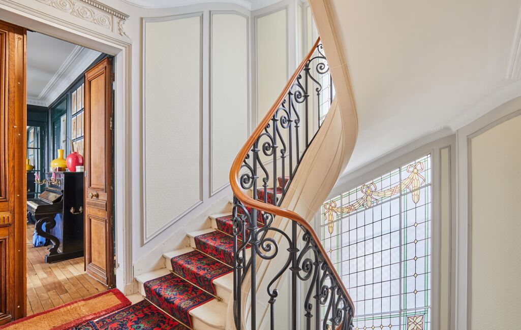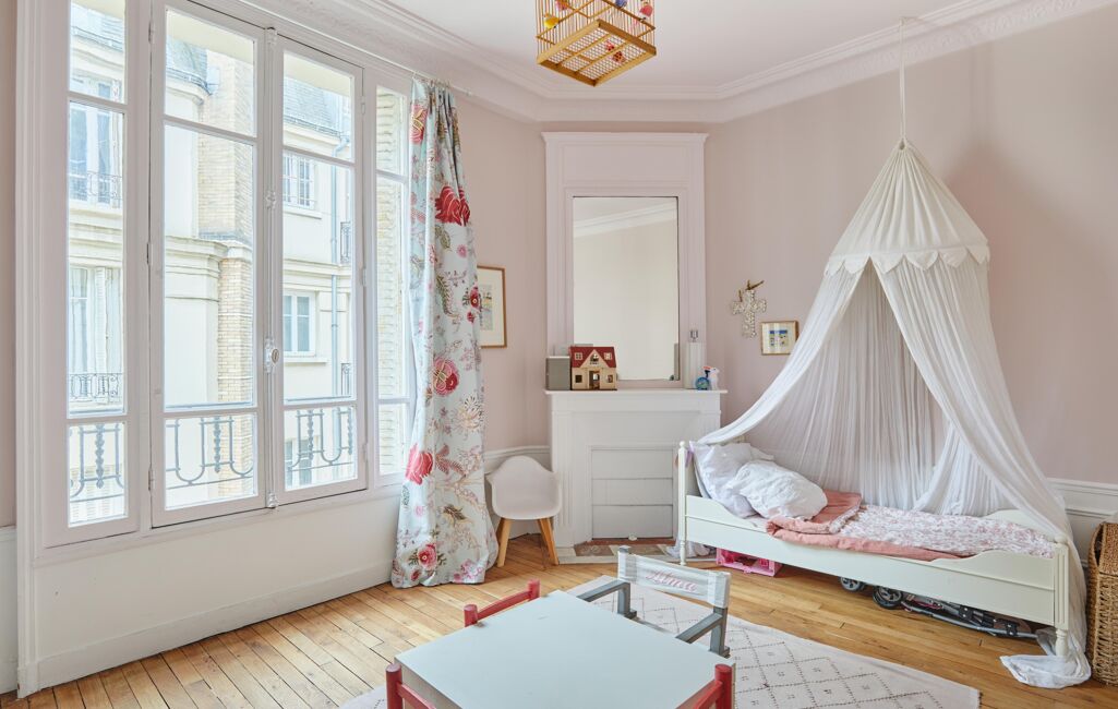 Au 5ᵉ étage d'un immeuble ancien de 1913 parfaitement entretenu avec ascenseur et gardienne à demeure, ce bien familial s'ouvre sur une entrée élégante menant à un vaste double séjour de 42m2 baigné de lumière grâce à son exposition Ouest, prolongé par un balcon offrant une vue dégagée.