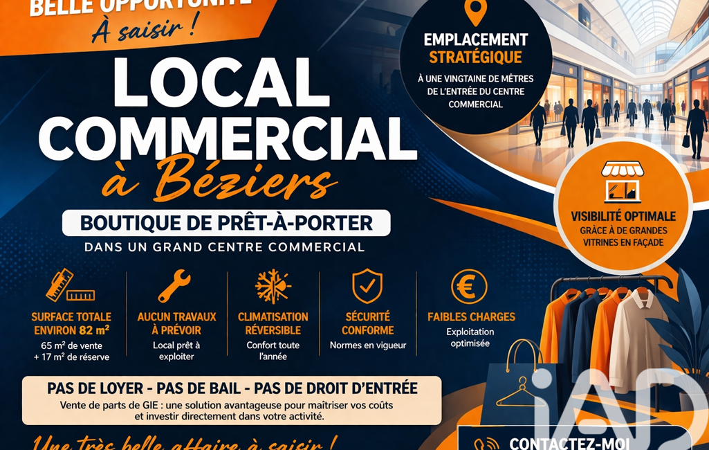iad France - Olivier Gioia vous propose: *** LOCAL COMMERCIAL / CESSION D’ACTIVITÉ À BÉZIERS – BOUTIQUE PRÊT-À-PORTER – EMPLACEMENT STRATÉGIQUE EN CENTRE COMMERCIAL ***