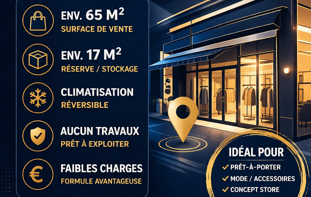 Ce local commercial d’environ 85 m², actuellement exploité en boutique de prêt-à-porter, bénéficie d’un environnement commerçant attractif, d’un flux clientèle régulier et d’une excellente visibilité grâce à sa large vitrine en façade.