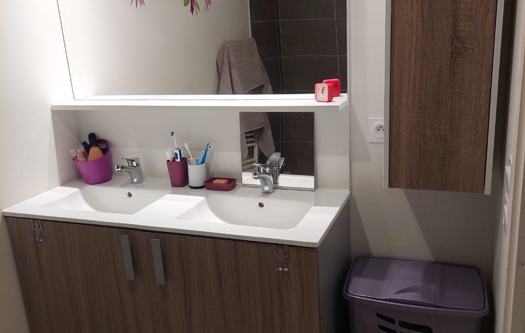 - une salle de bain de 4,7m2 équipée d'une paroi amovible, double vasques et rangements