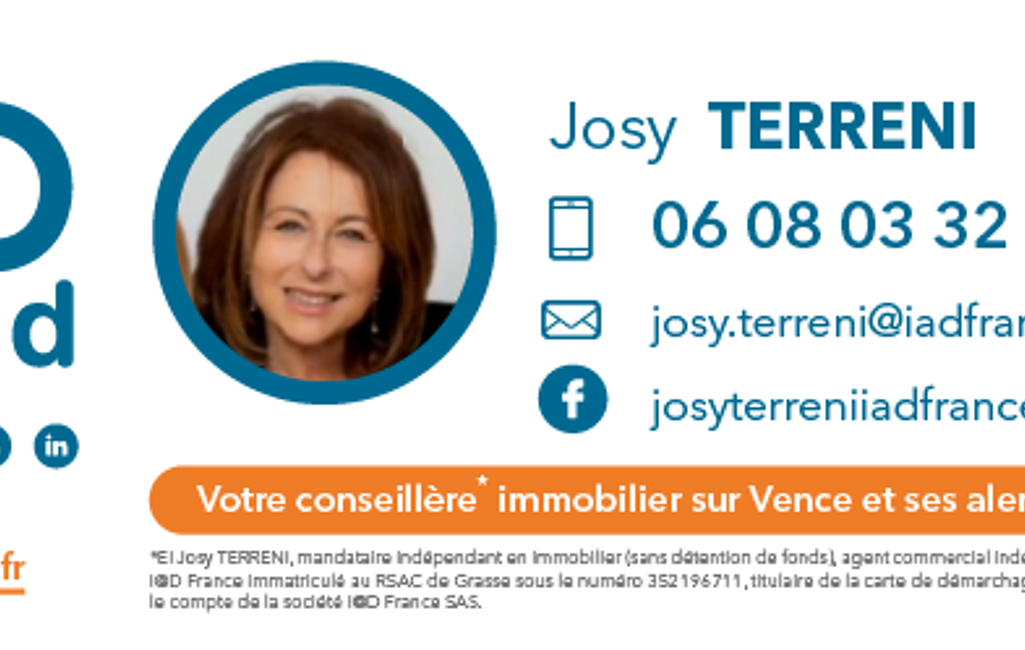La présente annonce immobilière a été rédigée sous la responsabilité éditoriale de Mme Josy Terreni mandataire indépendant en immobilier (sans détention de fonds), agent commercial de la SAS I@D France immatriculé au RSAC de GRASSE sous le numéro 352196711, titulaire de la carte de démarchage immobilier pour le compte de la société I@D France SAS.