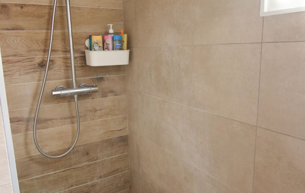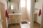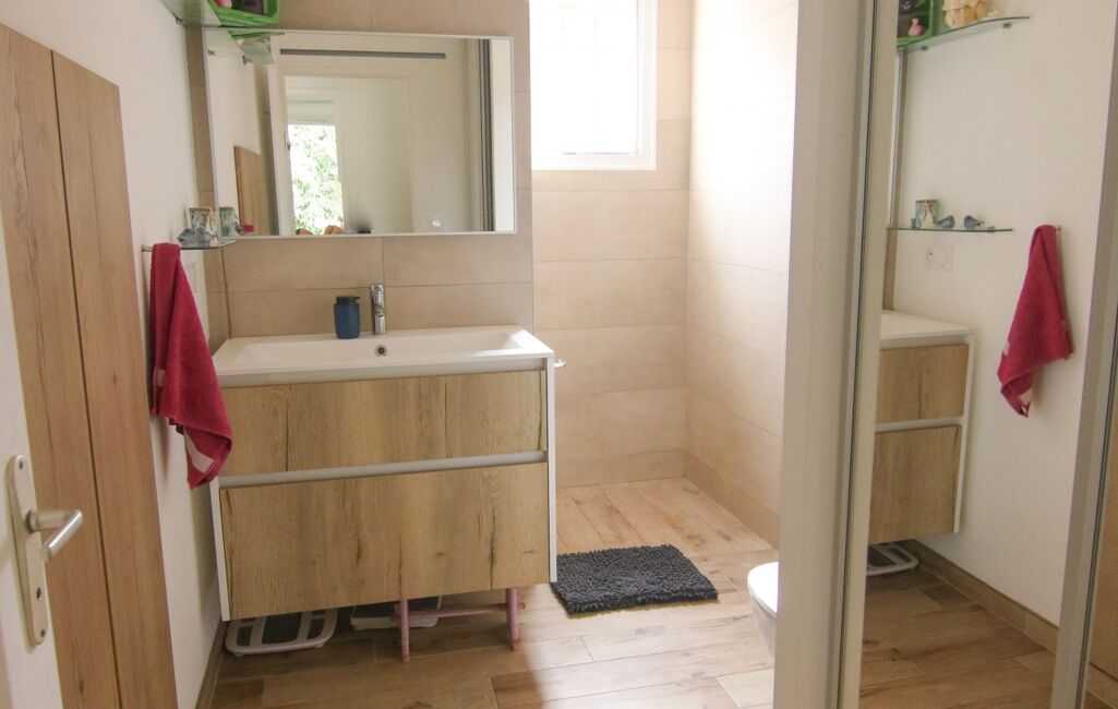 La salle d’eau moderne est équipée d’une douche à l’italienne, d'une vasque, d'un placard et d'un WC.