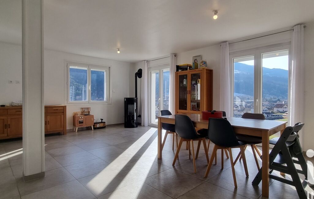 La maison développe 126 m² au sol sur une parcelle entièrement close de 669 m². L’exposition sud-est apporte une belle clarté dans la pièce de vie. La vue sur le lac et les montagnes accompagne naturellement les moments du quotidien.