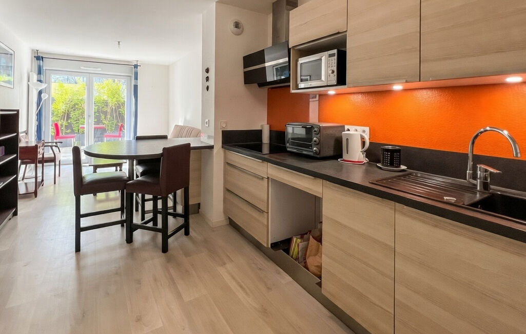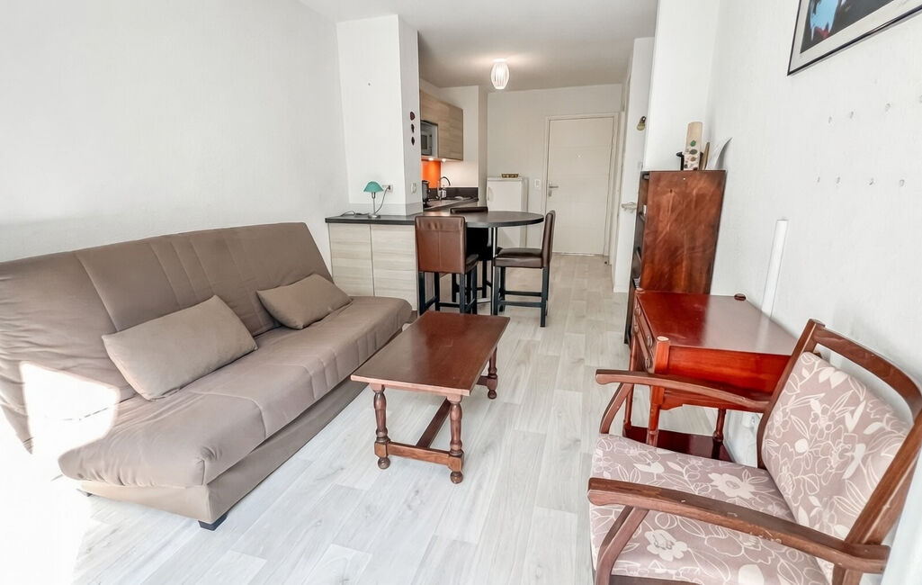 L'appartement offre un séjour lumineux avec cuisine équipée, complété par un cellier attenant, idéal pour le rangement.