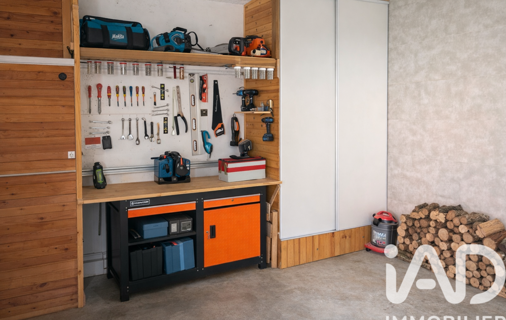 . La maison dispose également d’une arrière-cuisine / buanderie, d’un cellier aménagé avec bar, d'un local piscine ainsi que d’un double garage avec porte motorisée et faux grenier.