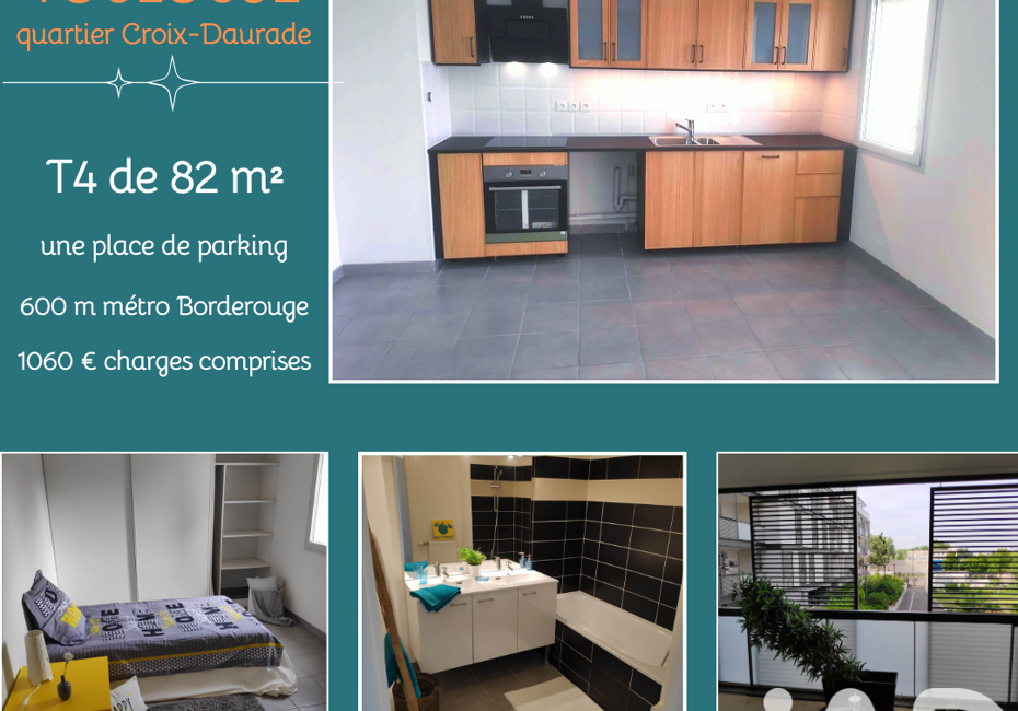 Iad France - Rebecca Pineau vous propose : Toulouse Nord quartier Croix-Daurade 31200 - à proximité immédiate du Lycée Raymond Naves, 600 mètres de la station de métro Borderouge et 4.5 km de la gare Matabiau Appartement T4 lumineux de 82 m² avec une place de parking sous terrain et agréable loggia de 12 m² L'espace de vie se compose...