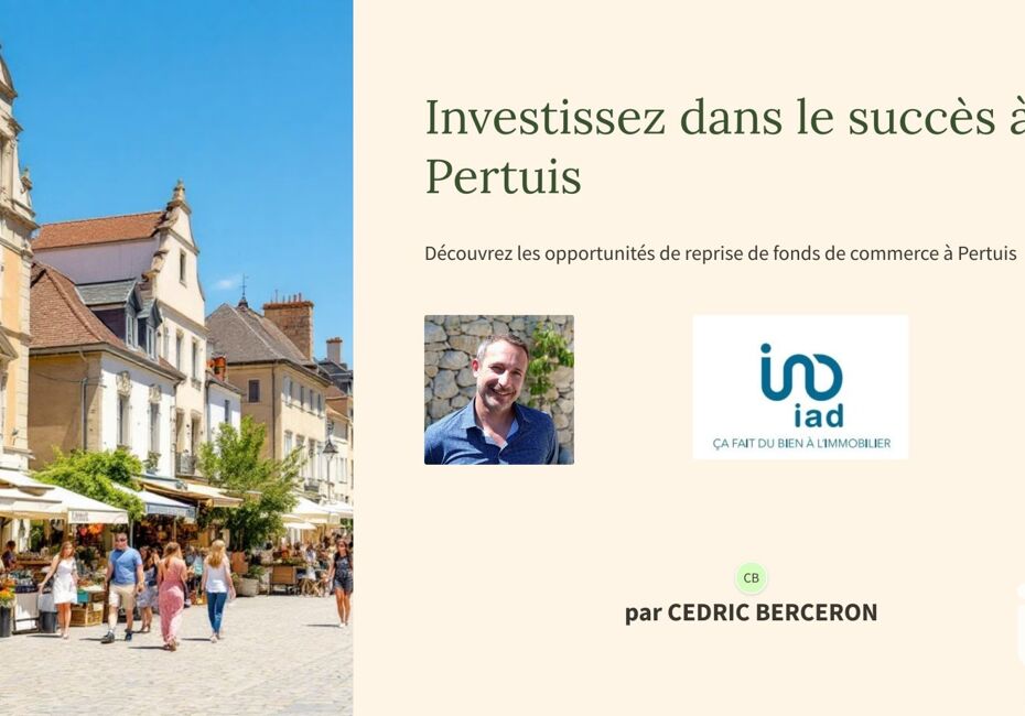 Iad France - Cédric Berceron (06 46 56 02 81) vous propose : Proposition d'annonce pour un fonds de commerce à Pertuis À vendre : Fonds de commerce idéalement situé à Pertuis Découvrez cette opportunité exceptionnelle pour un magasin de 60 m² environ, sans travaux à prévoir, très lumineux et situé dans une rue passante. Ce local...