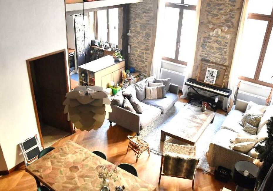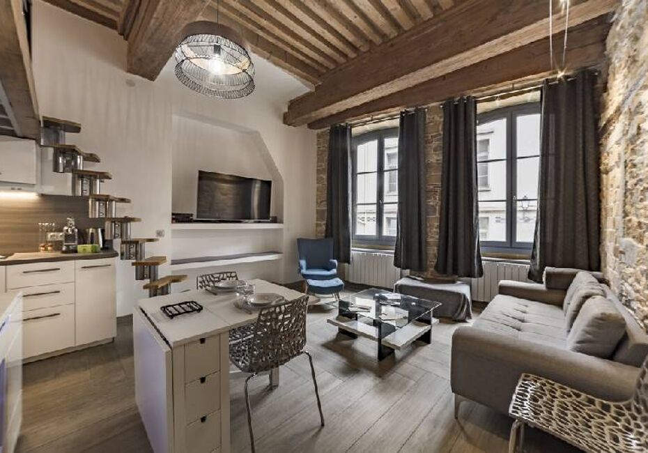 1490€CC / Mois A SAISIR sur LYON 05 Quartier ST GEORGES - Magnifique T2 meublé de 50 m² avec beaucoup de cachet et belles prestations - Composé d'un séjour ouvert sur cuisine équipée, murs en pierres apparentes, poutres apparentes, 1 chambre, salle de douche, wc, 1 mezzanine en plus, placards, double vitrage, très belles prestations...