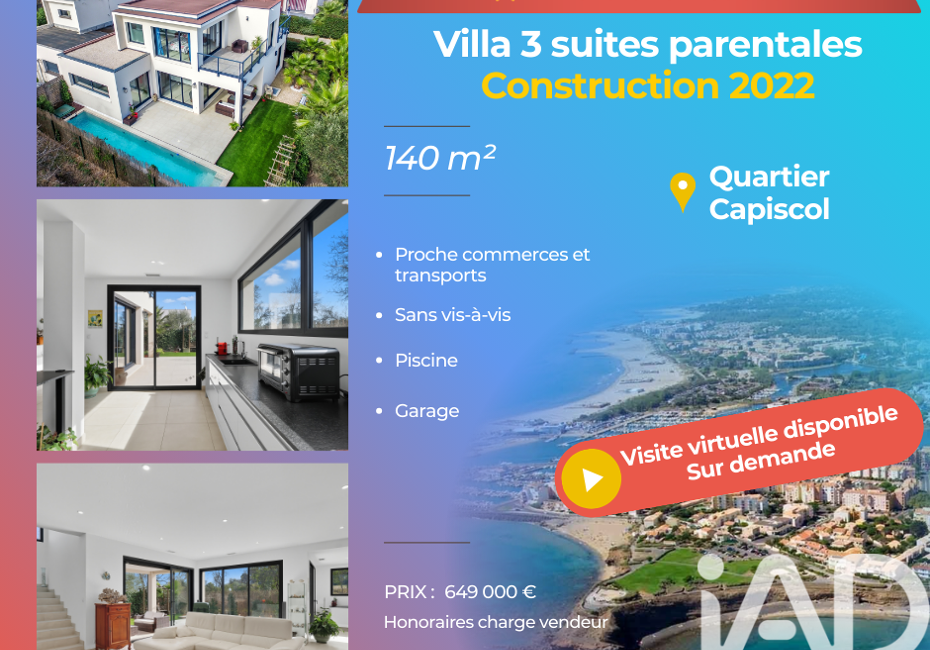 Iad France - Karim Mahmoud vous propose : Villa d’architecte 140 m² – Prestations de luxe iad Prestige – Karim Mahmoud vous propose : À VENDRE – Superbe villa contemporaine d’architecte, édifiée en 2022, offrant des finitions haut de gamme et un confort absolu. Vous recherchez une demeure unique, alliant élégance, modernité et...