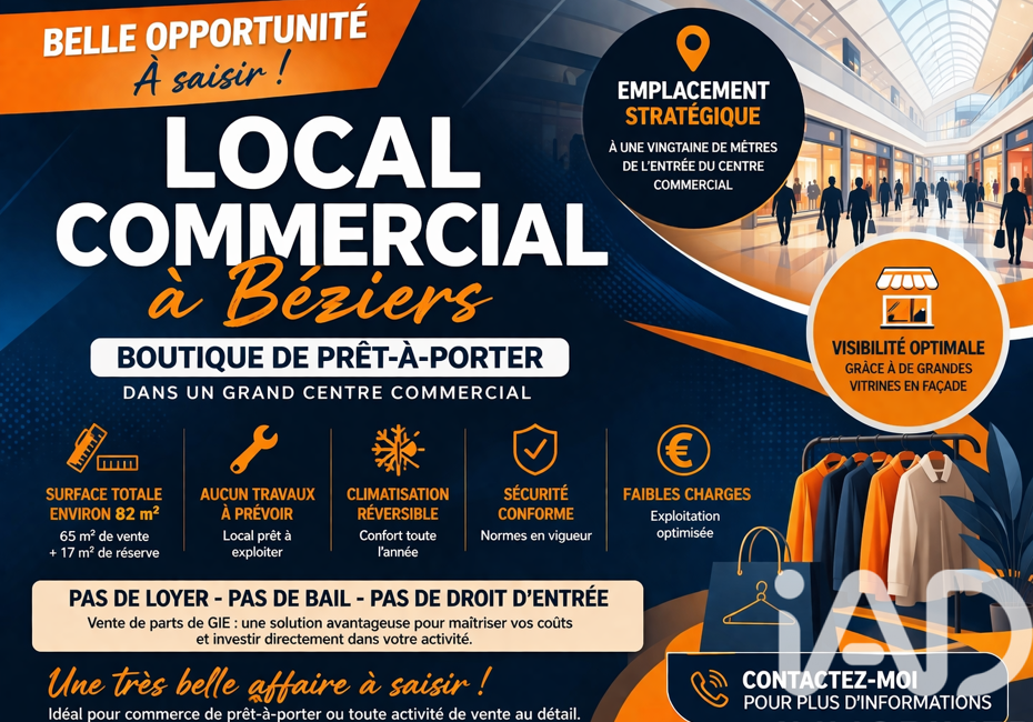 Iad France - Olivier Gioia vous propose : * LOCAL COMMERCIAL / CESSION D’ACTIVITÉ À BÉZIERS – BOUTIQUE PRÊT-À-PORTER – EMPLACEMENT STRATÉGIQUE EN CENTRE COMMERCIAL * Belle opportunité de reprise à Béziers, au sein d’un centre commercial dynamique et très fréquenté, idéalement situé à proximité immédiate de l’entrée...