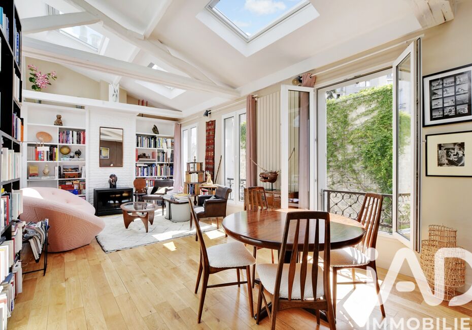Iad France - Sandrine Perez vous propose : À quelques pas du métro Laumière (ligne 5) et du Canal - Dans une jolie cour pavée et fleurie - Loft de 102 m² (92 carrez), situé au 1er et dernier étage avec vue dégagée comprenant : une entrée, une belle pièce à vivre, une cuisine indépendante, aménagée et équipée menant à un toit...